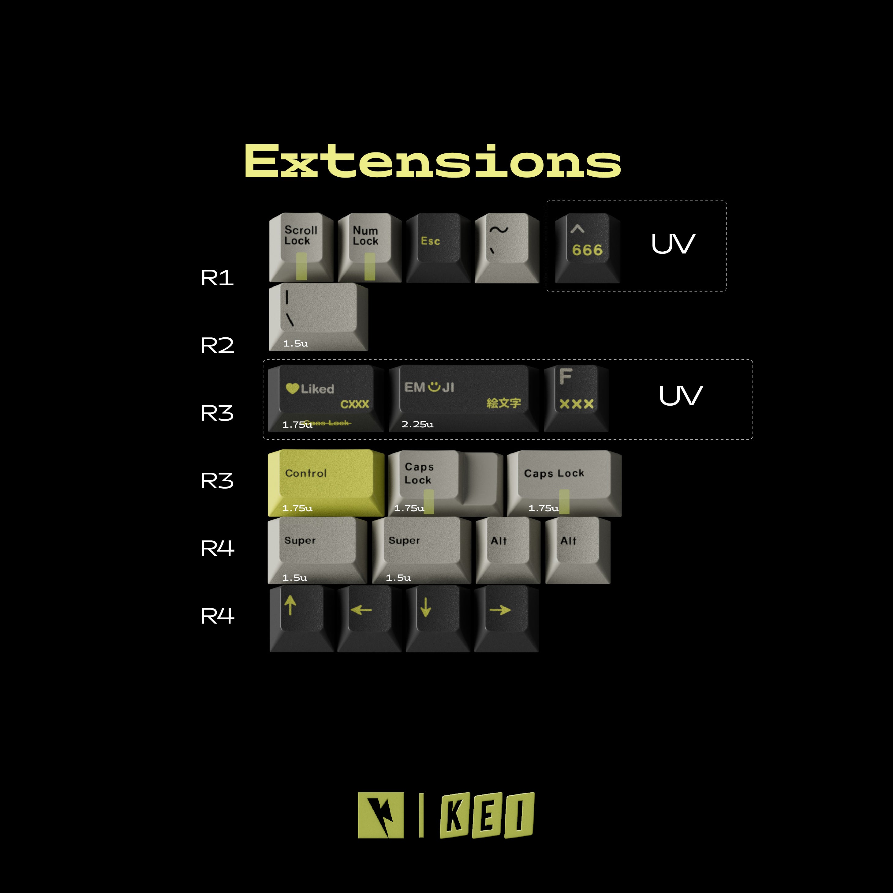 The overall color scheme sticks to sleek black and gray, with pops of neon yellow to keep things fresh and eye-catching. For the iconic keys, we picked a lineup of lively expressions and playful symbols, creating a bold and energetic visual contrast.